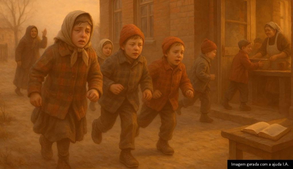 O assovio do vento, misturado ao fungar dos narizes, soma-se ao barulho das vozes tagarelas dos valentes meninos e meninas que dobram a esquina correndo, apressados para terminar o percurso ao avistar a grande escola. Entram aos atropelos!