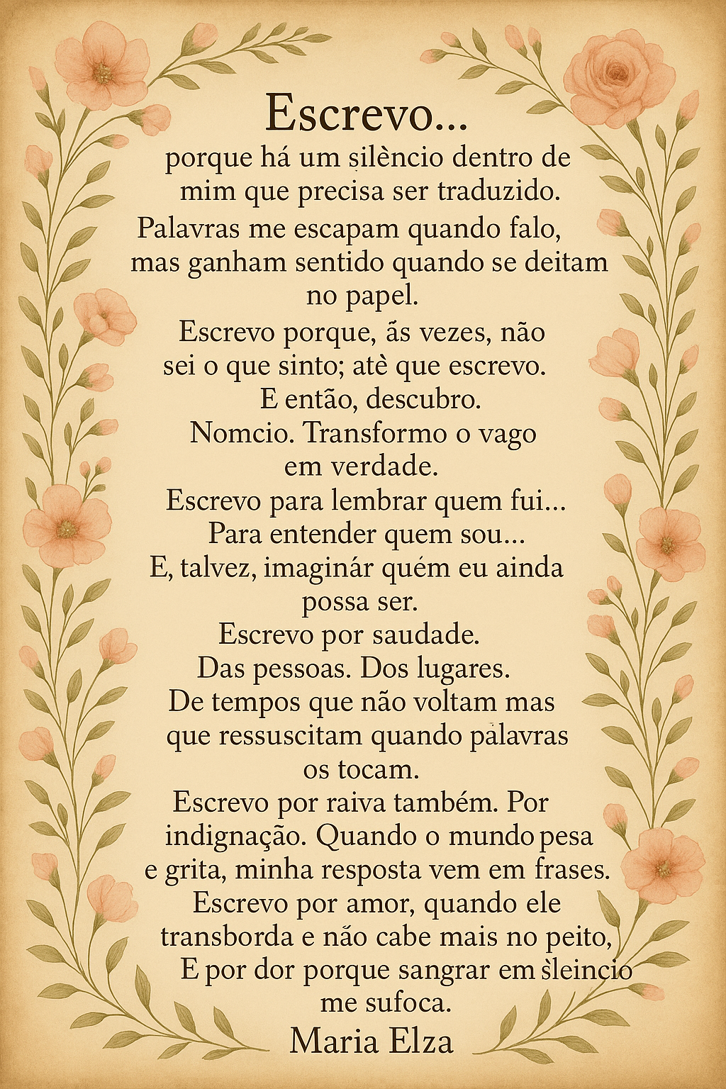 Me autodenominei Divina, Perfeita e Maravilhosa. Não é por vaidade e sim porque acredito que foi assim que Deus nos criou: à sua imagem e semelhança. Mesmo que humanamente isso pareça impossível, ao expressar minha crença me sinto bem. Busco o melhor sempre. Tenho fases, sou de Libra e isso ajuda a explicar minhas qualidades e meus defeitos. Amo a vida, minha família, meus amigos. Sou Formada em Administração e Direito e estudiosa da escrita criativa. Sempre gostei de ler! Amo ler tanto os romances, como os contos, crônicas, documentários, biografias… Mas minha maior bagagem é de vida, pois ela é a matéria prima para o que escrevo. A vida, as pessoas e suas histórias me encantam. E esse encantamento se transforma em letras. Amo muito, preocupo-me muito, erro muito, e procuro muito acertar! Vou dividir com vcs um pouco da minha experiência de vida, neste espaço que considero meu "travesseiro virtual" e o convido a compartilhá-lo comigo. Venha?! Criei este blog em agosto de 2010 na plataforma blogspot. Posteriormente o trouxe para o WordPress . Desde 2024 estou escrevendo crônicas e vou disponibiliza-las aqui. No site https://.www.cronicascariocas.com.br procure por Maria Elza no Menu Autores, para ler meus contos e crônicas. Ah, deixe seu comentário, pois quero saber a sua opinião! Ver mais posts
